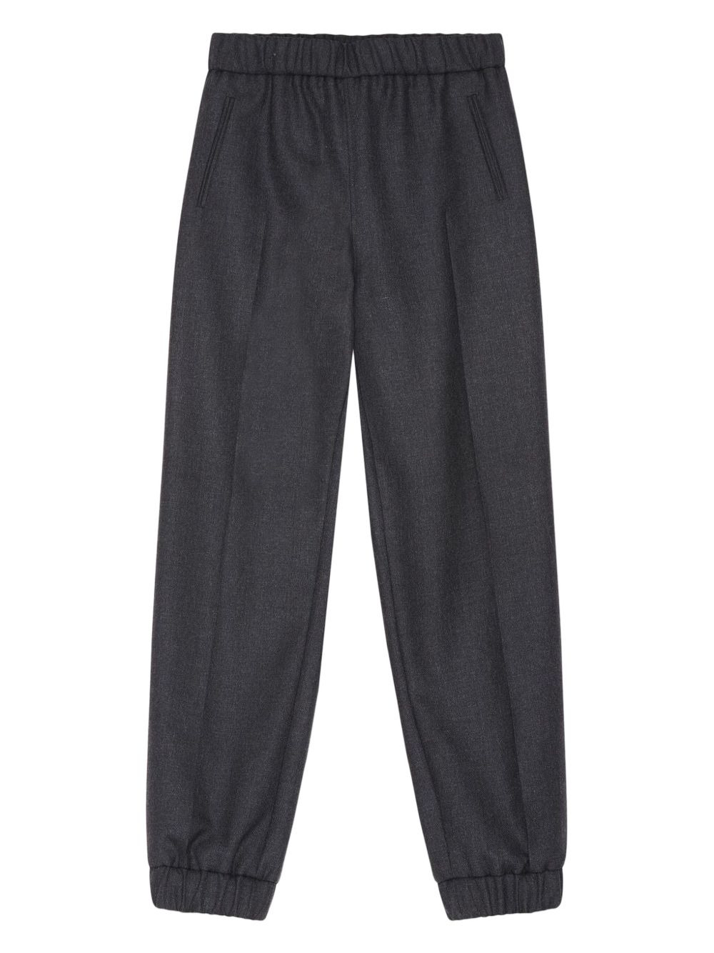 elasticated-waistband trousers Highlights - Dark grey - Elasticated waistband - Cuffed hems - Side pockets Imported Composition Polyester 55%, Virgin Wool 45% Washing instructions Read Manufacturer Guidelines