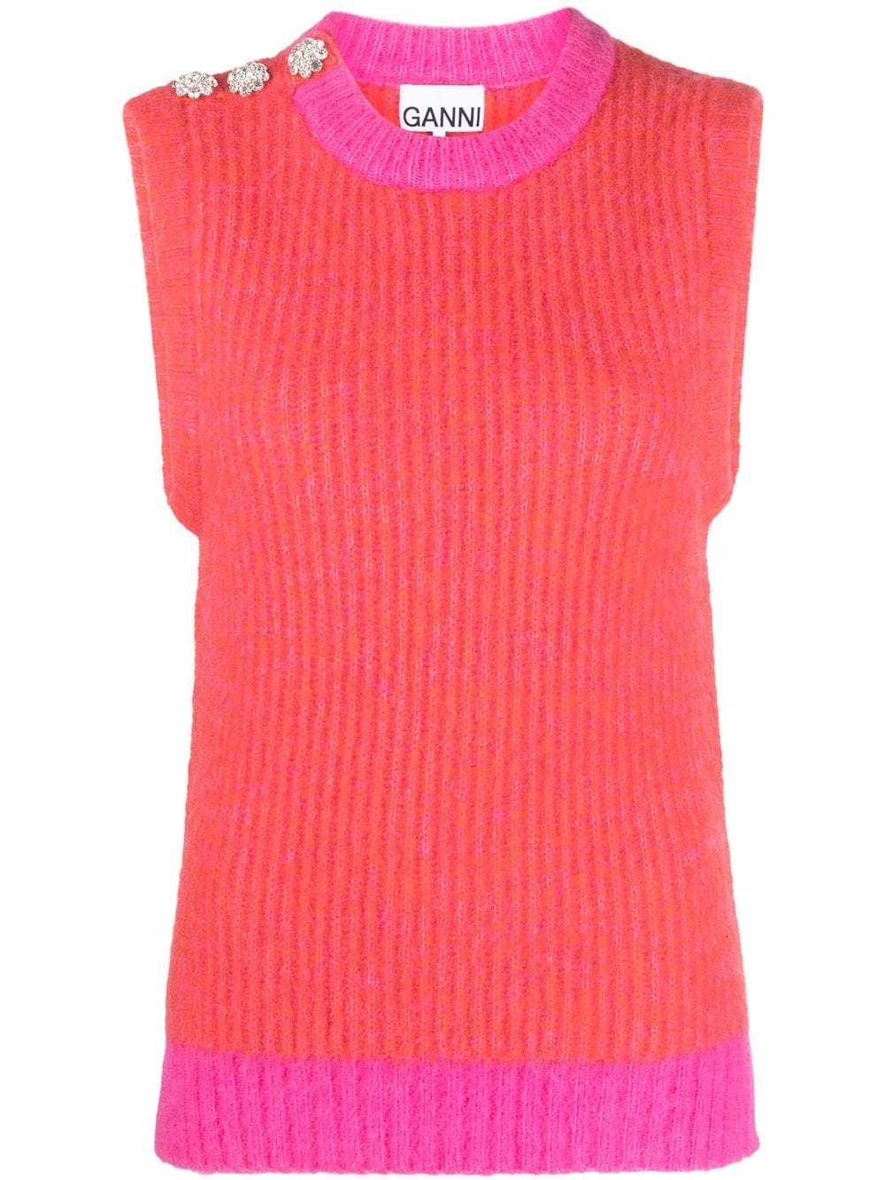 embellished wool-blend vest Crafted from a soft blend or merino and alpaca wool, this GANNI rib-knit vest is elevated by a contrasting trim. Three signature crystal-embellished buttons sit at one shoulder. Imported Composition Merino 32%, Alpaca Wool 32%, Polyamide 30%, Spandex/Elastane 6% SIZE & FIT Model measurements Height 5 ft 12 in(1.82 m) Bust/Chest 34.25 in(87 cm) Hips 37.79 in(96 cm) Waist 25.19 in(64 cm) Measurement BUST 40.15 in(102 cm) FittingInformation This piece fits true to size. We recommend you get your regular size Cut for a slim fit Made with a mid-weight fabric Washing instructions Hand Wash