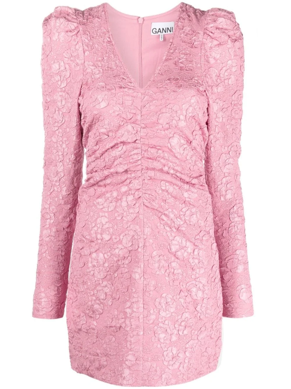 floral-jacquard tonal minidress Highlights - Powder pink - Recycled polyester blend - Tonal design - Patterned jacquard - V-neck - Rear zip fastening - Long sleeves - Thigh-length - Straight hem Imported Composition Outer: Recycled Polyester 55%, Polyester 45% Lining: Recycled Polyester 92%, Spandex/Elastane 8% Washing instructions Hand Wash