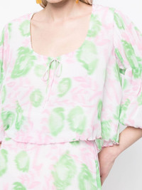 floral-print pleated georgette blouse GANNI's romantic aesthetic for SS23 shines through in this pleated georgette blouse. Patterned with abstract blooms, the breezy design is defined by its puff sleeves and flowy lettuce hem. Highlights - Blush pink/white/green - Recycled polyester - Georgette - Fully pleated - All-over floral print - U-neck - Three-quarter length puff sleeves - Cropped - Lettuce hem Imported Composition Recycled Polyester 100% SIZE & FIT Model measurements Height 5 ft 10 in(1.77 m) Bust/Chest 31.88 in(81 cm) Hips 33.85 in(86 cm) Waist 24.01 in(61 cm) FittingInformation Designed to be unstructured, offering a loose fit throughout Cropped in length Made from a lightweight non-stretch fabric, this piece offers minimal elasticity when worn This piece fits true to size – take your usual size Washing instructions Machine Wash