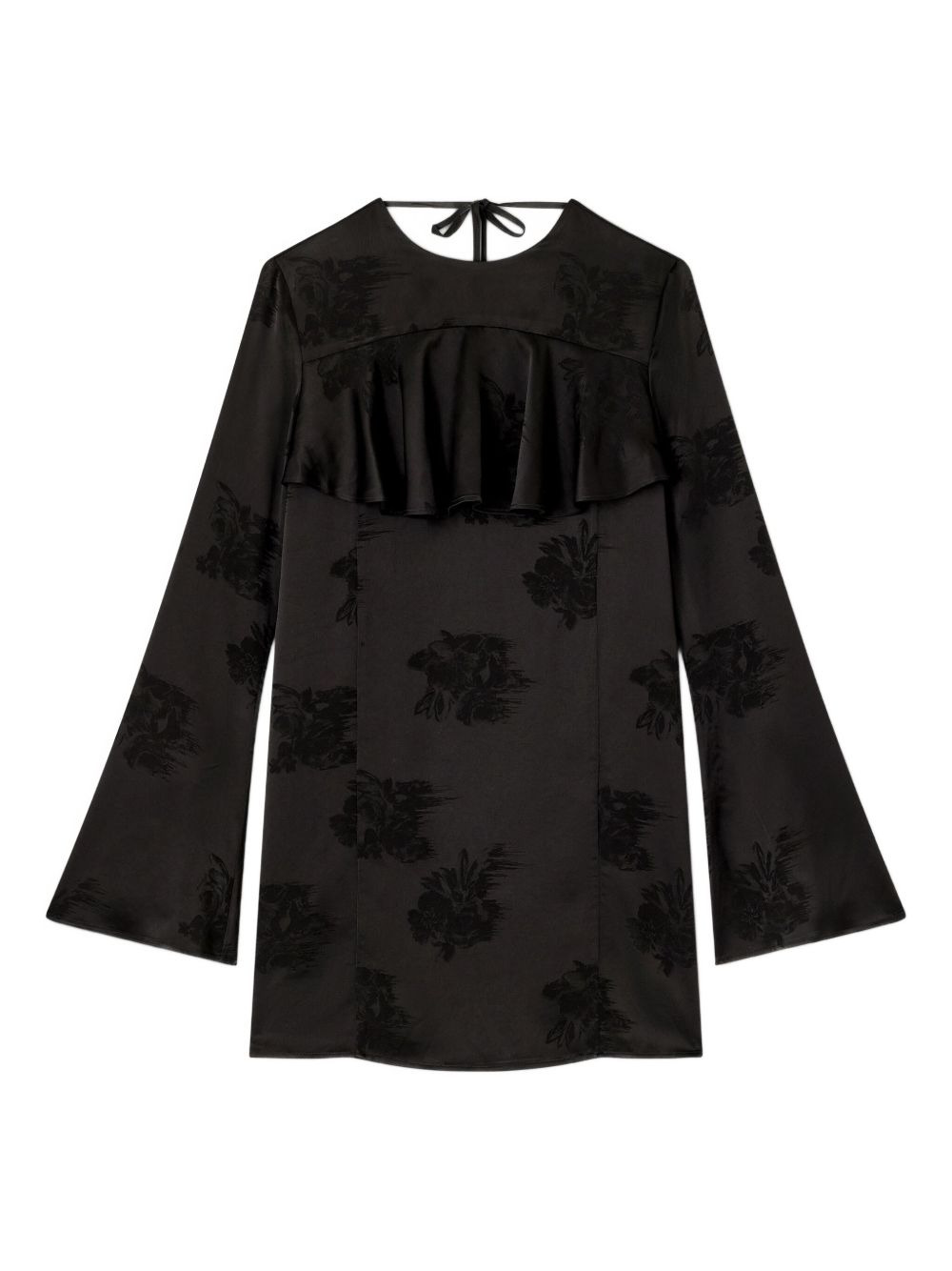floral-print ruffled mini dress Highlights - Black - Floral print - Ruffled neckline - Long sleeves - Bell sleeves Imported Composition Fabric 100% Washing instructions Read Manufacturer Guidelines