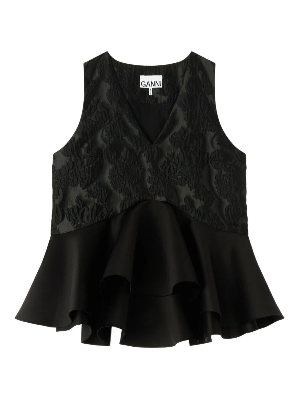 floral ruffled top Highlights - Black - Floral detail - V-neck - Sleeveless - Ruffled hem Imported Composition Fabric 100% Washing instructions Read Manufacturer Guidelines