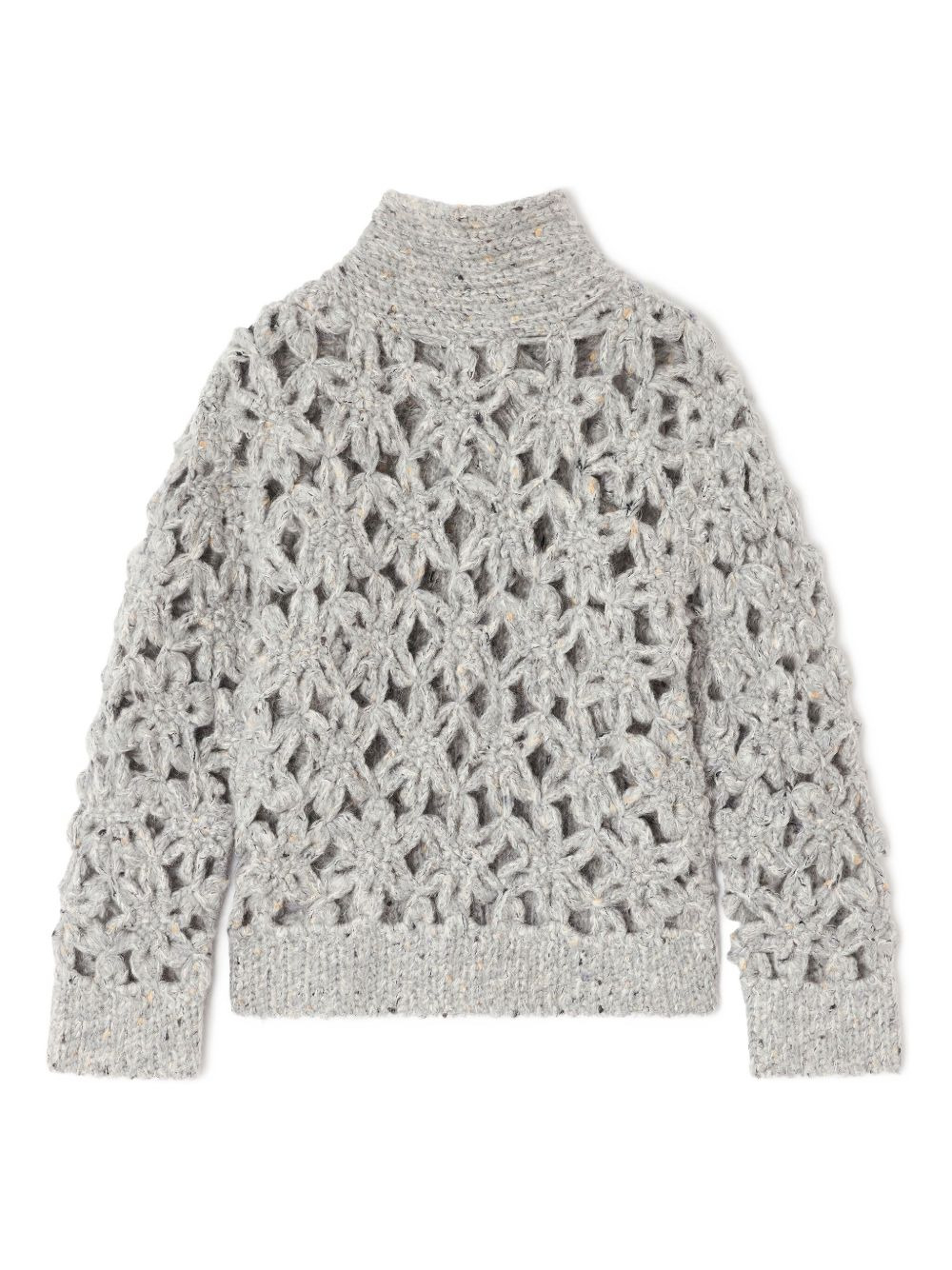 flower crochet alpaca sweater Highlights - Light grey - Flower crochet pattern - High neck - Open knit - Crossed back detail Imported Composition Wool 63%, Mohair 15%, Polyacrylonitrile 9%, Alpaca 6%, Polyamide 5%, Polyester 1%, Elastane 1% Washing instructions Read Manufacturer Guidelines