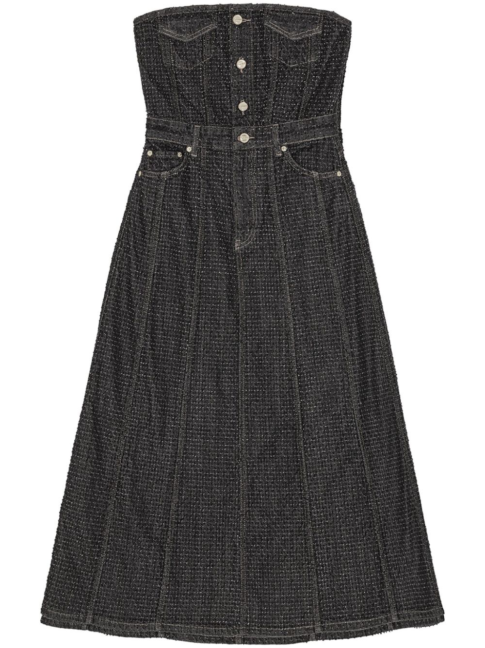 Fluffy denim midi dress Highlights - Black - Organic cotton - Denim - Textured finish - Front button fastening - Strapless - Contrast stitching - Decorative button flap - Gold-tone buttons - Rivet detailing - Belt loops - Fitted waistline - A-line - Straight hem - Mid-length Imported Composition Organic Cotton 100% Washing instructions Read Manufacturer Guidelines