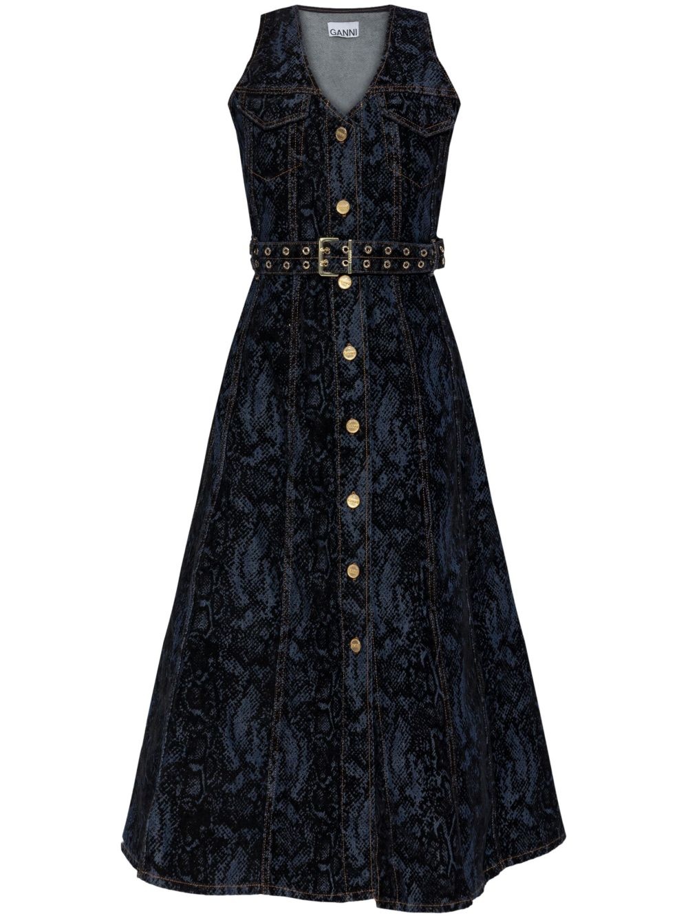 Ganni dress Highlights - Indigo blue - Front button fastening - V-neck - Detachable and adjustable waist belt - Sleeveless Imported Composition Outer: Organic Cotton 100% Lining: Recycled Polyester 100% Washing instructions Read Manufacturer Guidelines