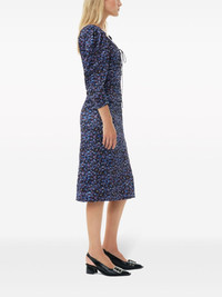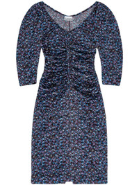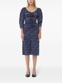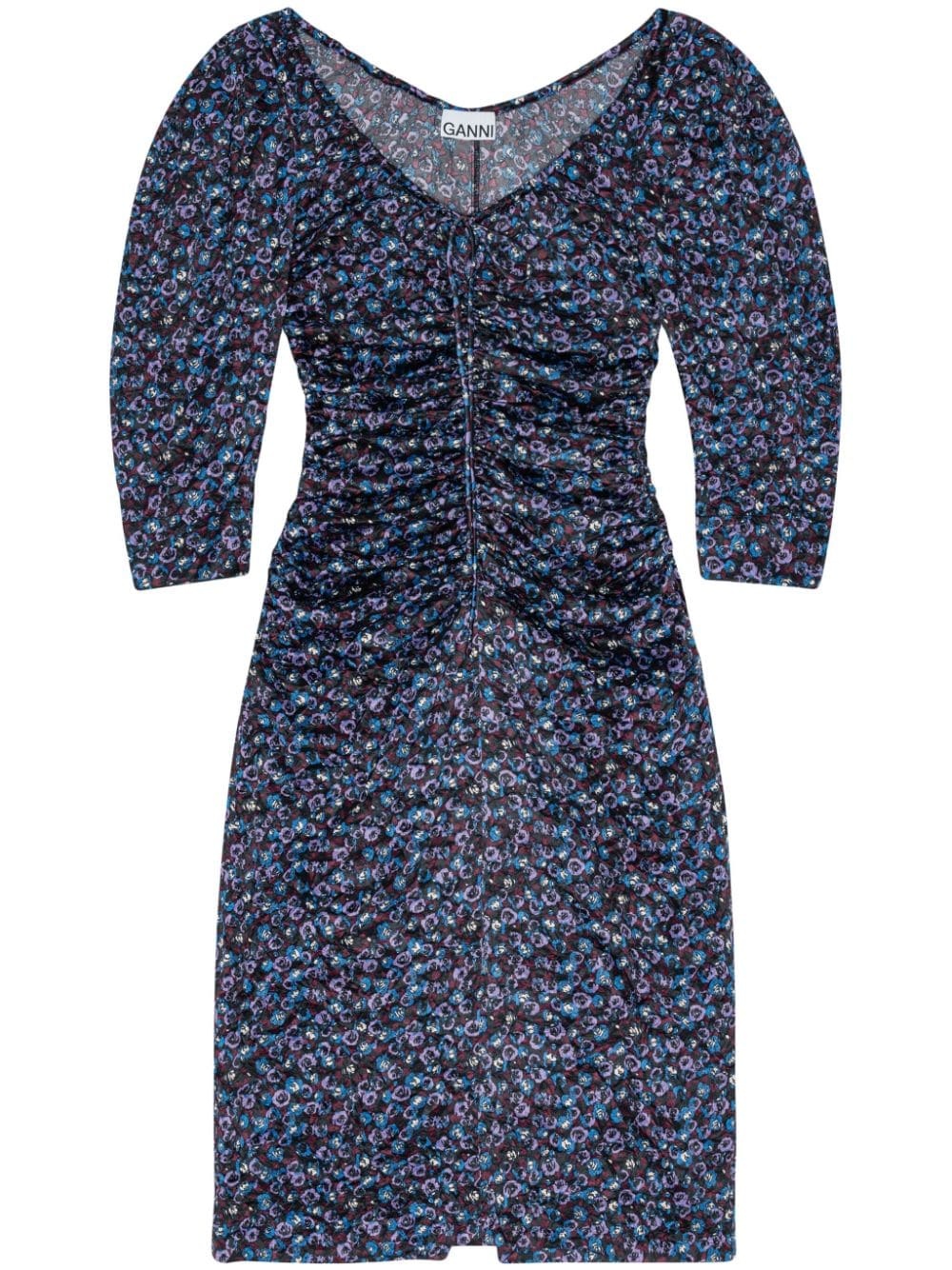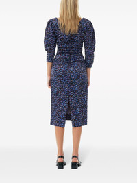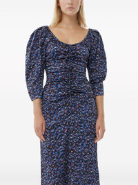 gathered satin midi dress Cut from a blend of recycled materials, Ganni's midi dress is detailed with a floral print and gathering at the bodice. Highlights - Blue/multicolour - Recycled polyester blend - Satin finish - Stretch-design - All-over floral print - Gathered detailing - U-neck - Three-quarter length sleeves - Rear zip fastening - Rear slit - Knee-length Imported Composition Recycled Polyester 95%, Elastane 5% Washing instructions Machine Wash