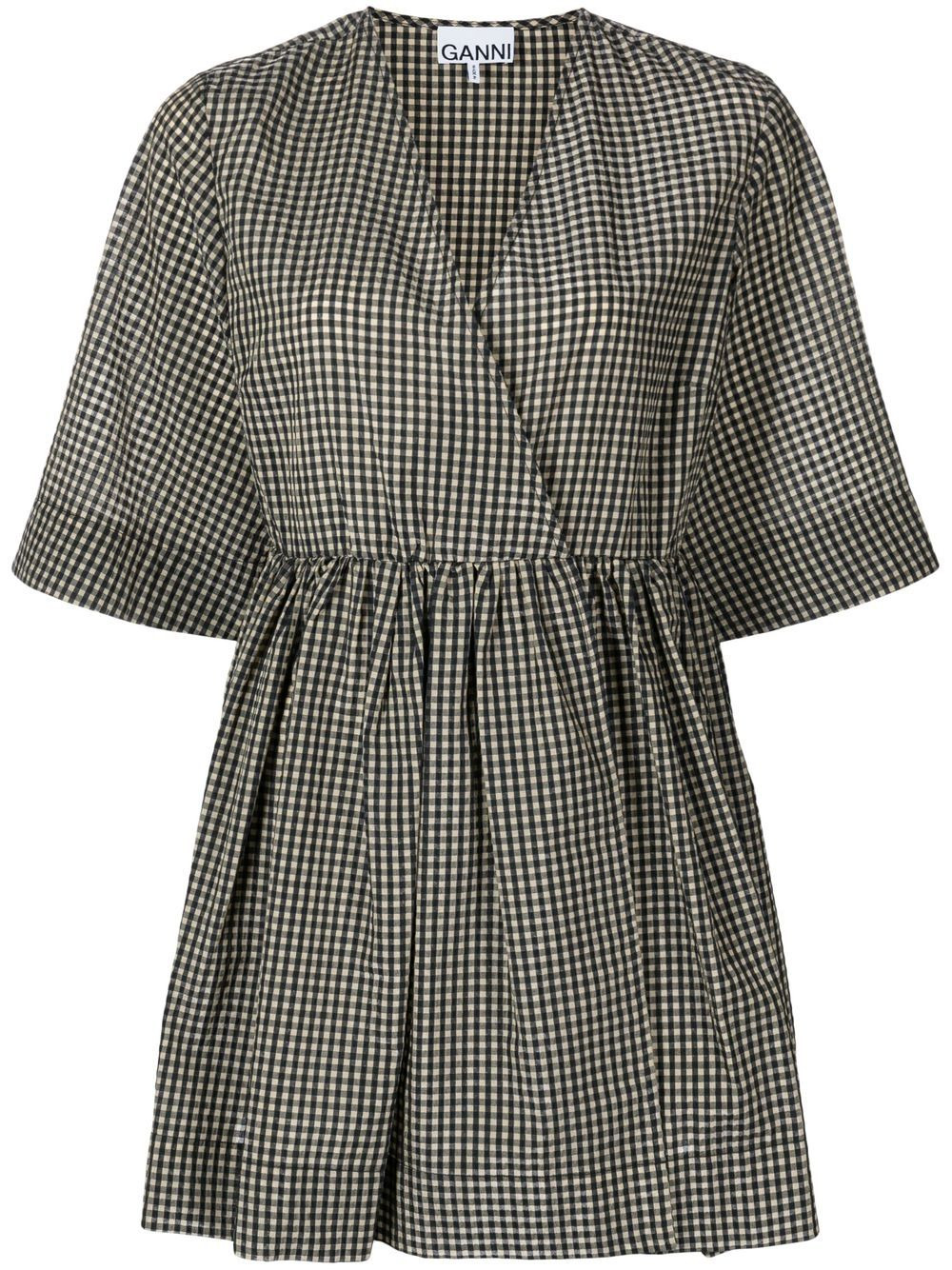 gingham-print seersucker minidress GANNI's playful aesthetic is defined by the brand's effortless take on the classics, updating them with a cool Scandinavian eye. Cut for a playful smock silhouette, this dress is adorned with a muted take on gingham for AW22. Highlights - Brown - Organic cotton-recycled polyester blend - Fine check print - Seersucker texture - Wrap design - V-neck - Long sleeves Imported Composition Organic Cotton 44%, Recycled Polyester 43%, Polyamide 13% SIZE & FIT Model measurements Height 5 ft 10 in(1.78 m) Bust/Chest 33.46 in(85 cm) Hips 35.43 in(90 cm) Waist 24.4 in(62 cm) FittingInformation This piece fits true to size. We recommend you get your regular size Cut for a loose fit Made with a mid-weight non-stretch fabric Washing instructions Machine Wash