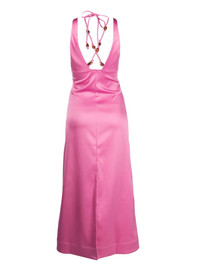 halterneck sleeveless midi dress Made from recycled polyester and elevated with a satin finish, this GANNI dress is rendered in an orchid pink hue evocative of the brand's playful and whimsical take on garments. Fastening around the neck with beaded strings, it boasts a plunging V-neck whilst falling to an A-line skirt. Imported Composition Lining: Recycled Polyester 100% Outer: Recycled Polyester 91%, Spandex/Elastane 9% Washing instructions Hand Wash