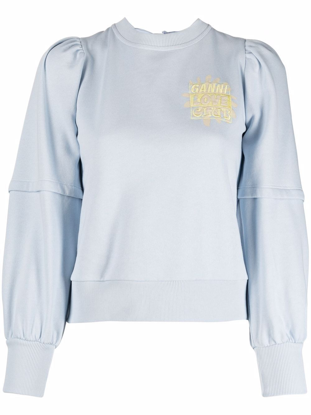 Isoli open-back jumper Continually working towards a more sustainable future, GANNI prides itself on monitoring its carbon footprint by using eco-conscious materials where possible. Crafted from soft organic cotton in a heather-blue hue, this Isoli open-back jumper is elevated by the 'GANNI LOVE CLUB' embroidery to the chest. Lantern-style balloon sleeves and gathered shoulders add a sense of playfulness to the knit. Highlights - Heather blue - Organic cotton - 'ganni love club' embroidered at the chest - Gathered shoulders - Crew neck - Balloon sleeves - Open back - Rear tie fastening - Ribbed trim Imported Composition Organic Cotton 100% SIZE & FIT Model measurements Height 5 ft 10 in(1.78 m) Bust/Chest 30.31 in(77 cm) Hips 36.61 in(93 cm) Waist 24.8 in(63 cm) FittingInformation This piece fits true to size. We recommend you get your regular size Cut for a relaxed fit Made with a mid-weight fabric Washing instructions Machine Wash