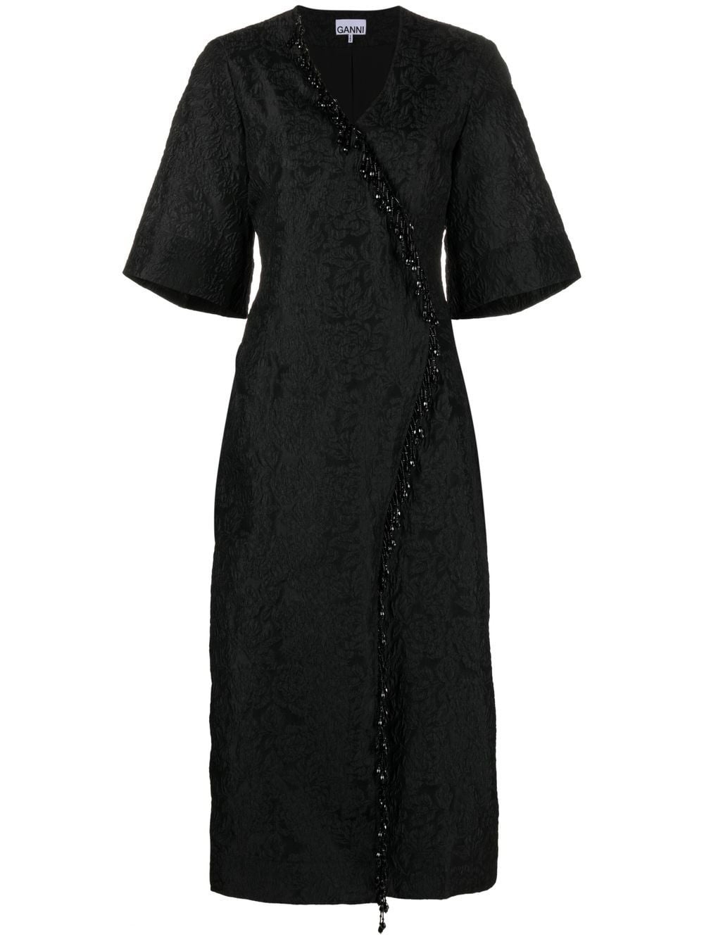 jacquard organza midi dress GANNI presents a play of textures and styles here. Cut to a boxy, wrap silhouette, the all-black dress is finished with jacquard and lined with a beaded fringe for added detail. Highlights - Black - Recycled polyester blend - Organza - Full jacquard - Fringe detailing - Bead embellishment - Wrap design - V-neck - Short sleeves - Below-knee length Imported Composition Outer: Recycled Polyester 50%, Polyamide 32%, Polyester 18% Lining: Recycled Polyester 100% SIZE & FIT Model measurements Height 5 ft 10 in(1.77 m) Bust/Chest 31.49 in(80 cm) Hips 35.03 in(89 cm) Waist 23.22 in(59 cm) FittingInformation This piece fits true to size. We recommend you get your regular size Designed for a close fit at the bust, waist and hips Made with a mid-weight non-stretch fabric Washing instructions Hand Wash
