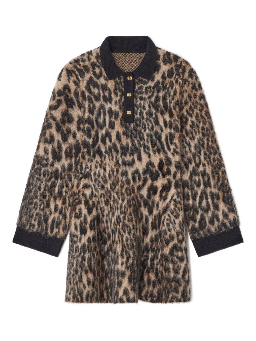 leopard-print button mini dress Highlights - Beige and black - Button fastening - Polo collar - Long sleeves - Ribbed cuffs Imported Composition Alpaca Wool 32%, Merino 32%, Polyamide 30%, Elastane 6% Washing instructions Hand Wash