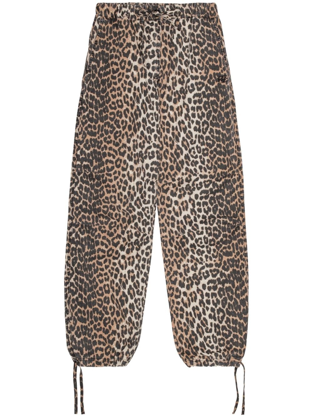 leopard-print drawstring trousers Crafted from a blend of organic cotton for a lower impact, Ganni's trousers are animated by a leopard print. Highlights - Black/beige - Organic cotton blend - Stretch-design - All-over leopard print - Elasticated waistband - Elasticated ankles - Rear patch pocket Imported Composition Organic Cotton 97%, Elastane 3%