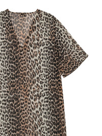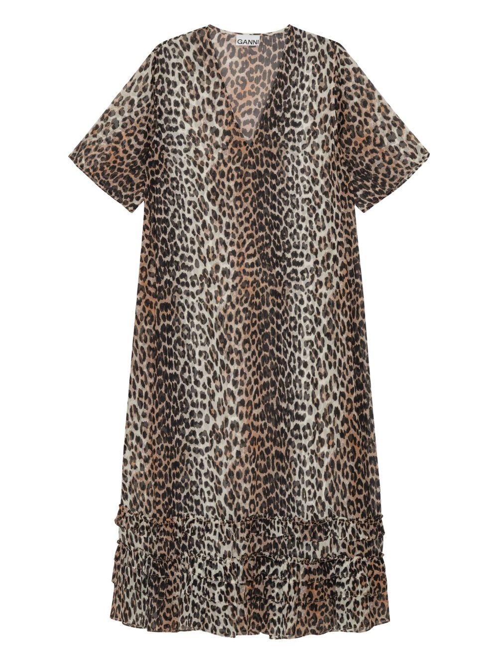 leopard-print ruffled dress Highlights - Beige - V-neck - Short sleeves - Tiered ruffle hem - All-over animal print Imported Composition Fabric 100% Washing instructions Read Manufacturer Guidelines