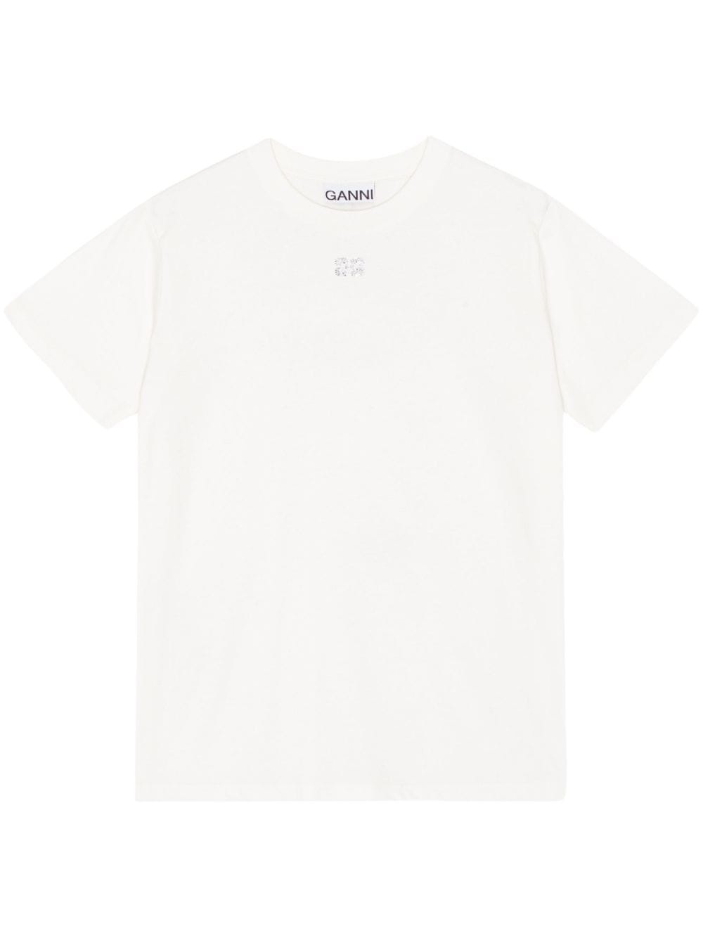 logo-embellished cotton T-shirt Reflective of GANNI's minimalist Scandinavian influence, this white T-shirt is cut from cotton to a short-sleeve silhouette solely embellished with the label's butterfly logo at the chest. Highlights - White - Cotton - Jersey texture - Logo embellishment - Crew neck - Short sleeves - Straight hem Imported Composition Cotton 100%