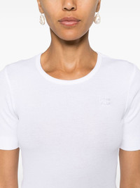 logo-embroidered ribbed T-shirt Highlights - White - Organic cotton blend - Fine ribbed - Crew neck - Short sleeves - Embroidered logo at the chest - Straight hem Imported Composition Organic Cotton 95%, Spandex/Elastane 5% SIZE & FIT Model measurements Height 5 ft 10 in(1.78 m) Bust/Chest 33.07 in(84 cm) Hips 36.61 in(93 cm) Waist 24.8 in(63 cm) FittingInformation Designed for a close fit throughout Made from a midweight stretch fabric, this piece offers elasticity and flexibility when worn This piece fits true to size – take your usual size