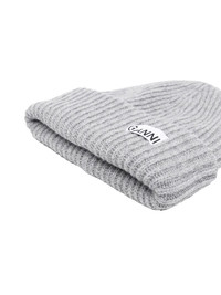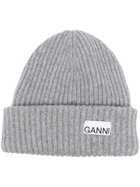 logo-patch rib-knit beanie Designed in a ribbed knit and detailed with a GANNI logo patch to the front, this recycled wool blend beanie gives cold-weather style a signature touch. Highlights - Grey - Wool-recycled wool blend - Ribbed knit - Logo patch to the front - Turn-up brim Made in Italy Composition Wool 45%, Recycled Wool 35%, Recycled Polyamide 20% Washing instructions Hand Wash