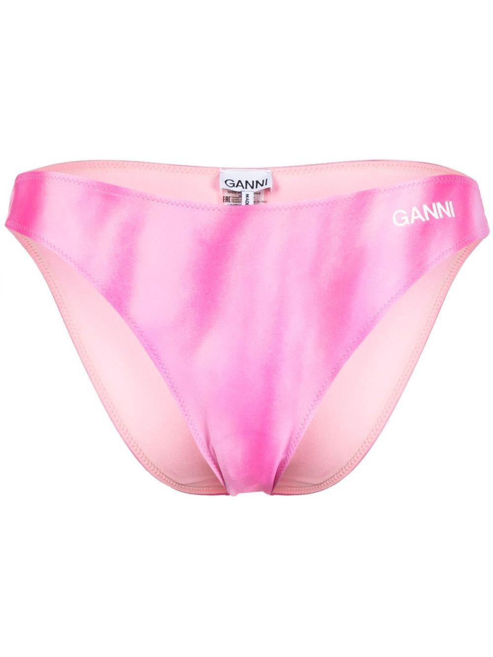 logo-print bikini bottoms logo-print bikini bottoms from GANNI featuring rose pink, cloud white, recycled polyamide blend, tie-dye pattern, logo print to the front and elasticated waistband. Be mindful to try on swimwear over your own garments.. POSITIVELY CONSCIOUS: This Planet Conscious product is crafted from certified recycled or upcycled materials, which helps you make a better choice for the environment as they generate less energy, save water and reduce the need for new raw materials. For recycled synthetic clothing products we highly recommend using a microfibre-catching washing bag to ensure that no microplastics that can pollute water are released in the process.. POSITIVELY CONSCIOUS: This brand measures the impact of every item they produce and supplies a Carbon Neutral Certification with each purchase, which measures the environmental impact of production and shows that they've covered the cost of making the carbon footprint neutral.. Imported Composition Outer: Recycled Polyamide 78%, Spandex/Elastane 22% Lining: Recycled Polyamide 83%, Spandex/Elastane 17% Washing instructions Machine Wash