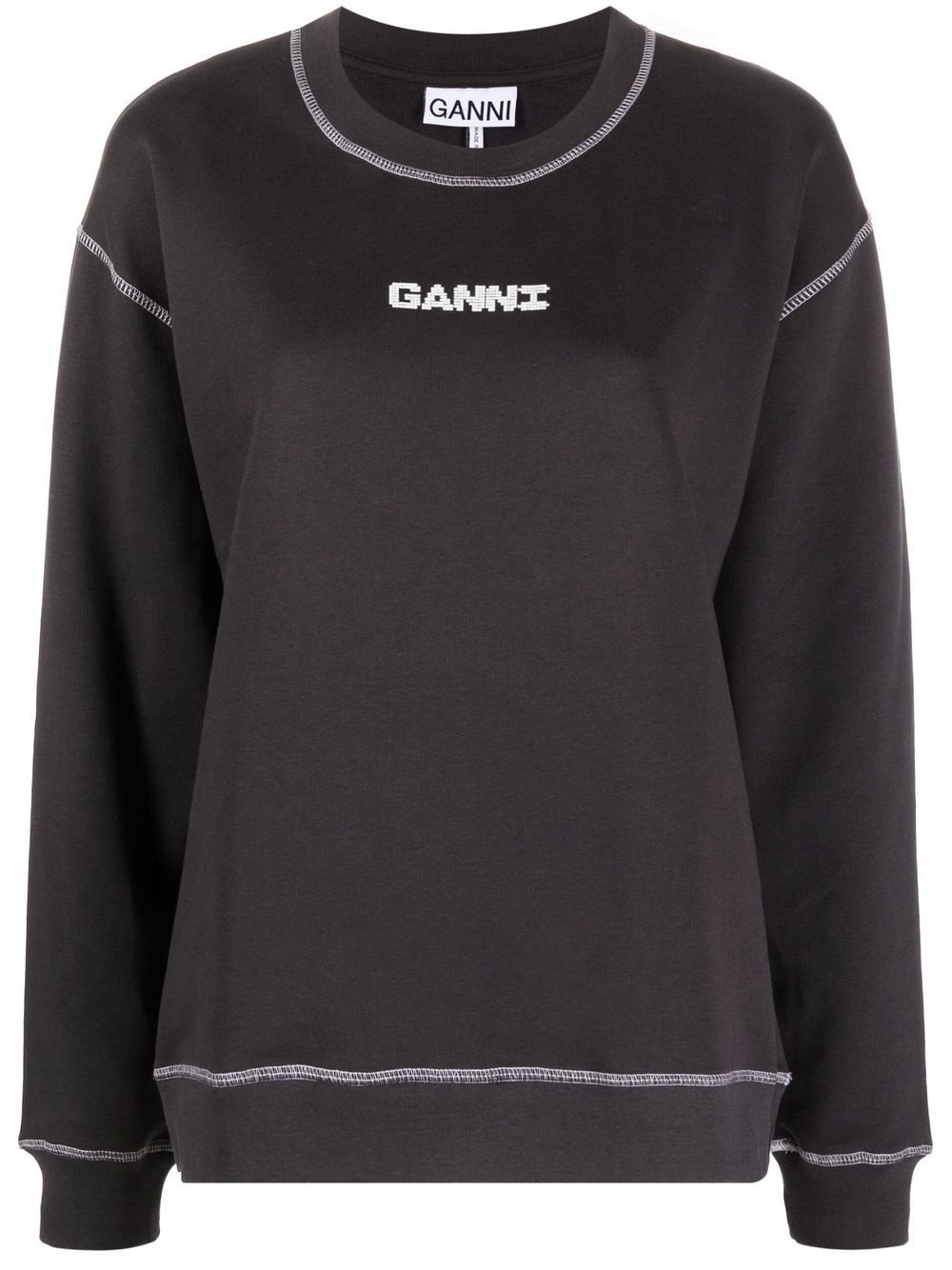 logo-print long-sleeve T-shirt GANNI's effortless design style is exhibited in this top for SS23. Decorated with contrasting seam detailing, this staple silhouette is defined by the logo print at the chest and floral graphic print at the rear. Highlights - Dark grey - Cotton - Logo print to the front - Graphic print to the rear - Round neck - Long sleeves - Seam detailing - Straight hem Imported Composition Cotton 100% SIZE & FIT Model measurements Height 5 ft 10 in(1.78 m) Bust/Chest 30.7 in(78 cm) Hips 34.64 in(88 cm) Waist 23.22 in(59 cm) FittingInformation This piece fits true to size. We recommend you get your regular size Cut for a loose fit Made with a mid-weight fabric Washing instructions Machine Wash