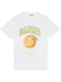 logo-print T-shirt Lift yourself with a dose of GANNI optimism by donning this white T-shirt. Spun from organic cotton fibres, it is printed with a radiant peach and a slogan calling on us to have a nice day and do our part for the environment by recycling. Highlights - White/multicolour - Organic cotton - Logo print to the front - Graphic print to the front - Crew neck - Short sleeves Imported Composition Organic Cotton 100% SIZE & FIT Measurement SLEEVE LENGTH 2.36 in(6 cm) Shoulder Width 14.96 in(38 cm) LENGTH 24.8 in(63 cm) WAIST 37 in(94 cm) BUST 37 in(94 cm)