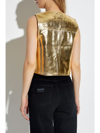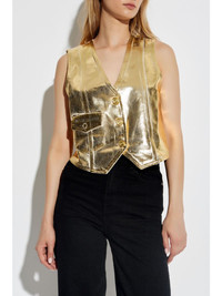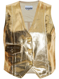 metallic organic cotton vest Highlights - Gold-tone - Organic cotton - Metallic effect - Sleeveless - Plunging v-neck - Front button fastening - Side flap pocket - Straight hem Imported Composition Organic Cotton 100% Washing instructions Read Manufacturer Guidelines