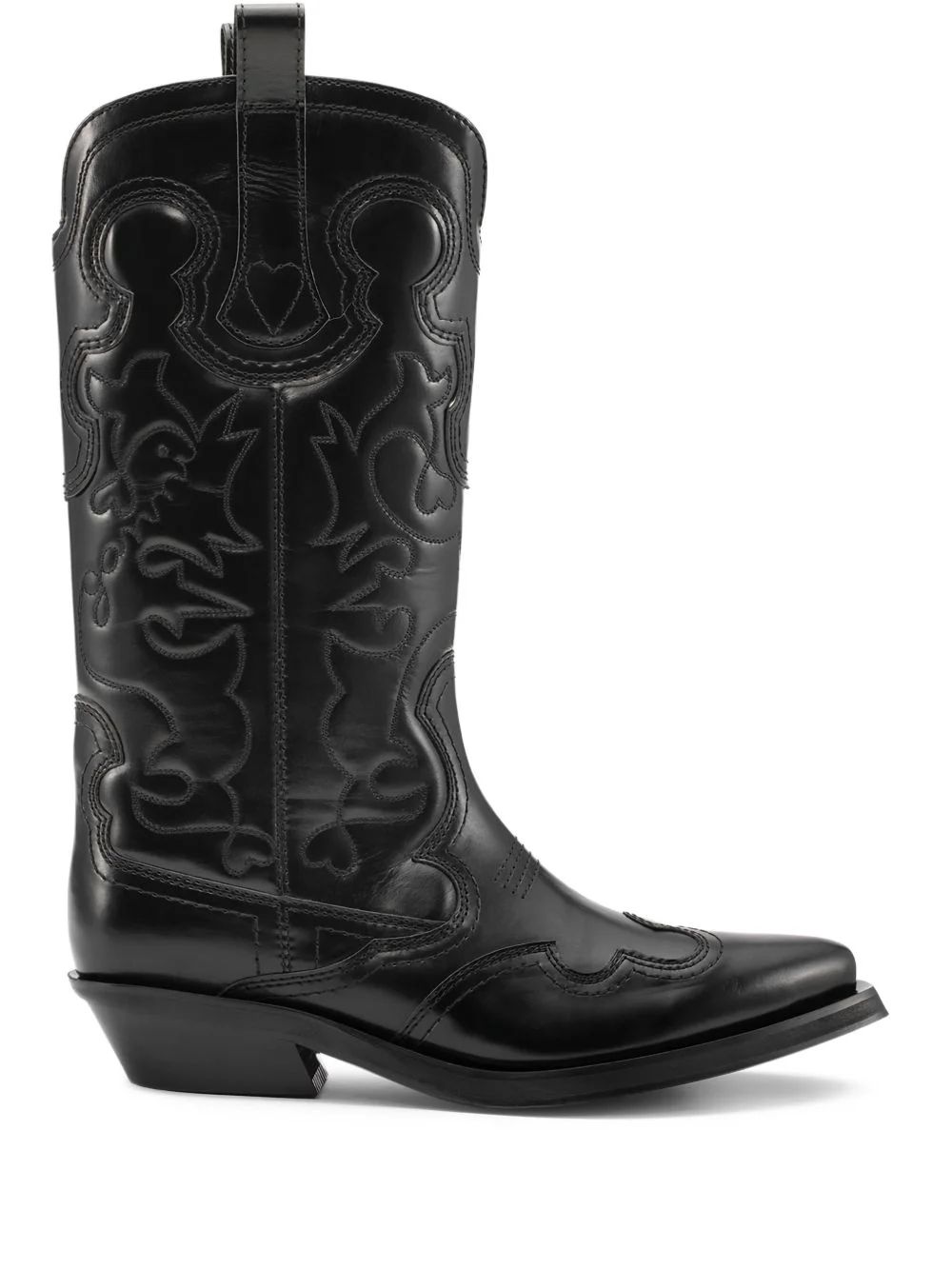 mid-shaft western boots Highlights - Black - Western design - Pointed toe - Block heel - Pull-on style - Pull-tab Imported Composition Outer: Recycled Calf Leather 45%, Recycled Polyester 20%, Polyurethane 20%, Polyester 15% Lining: Calf Leather 100% Sole: Calf Leather 100%