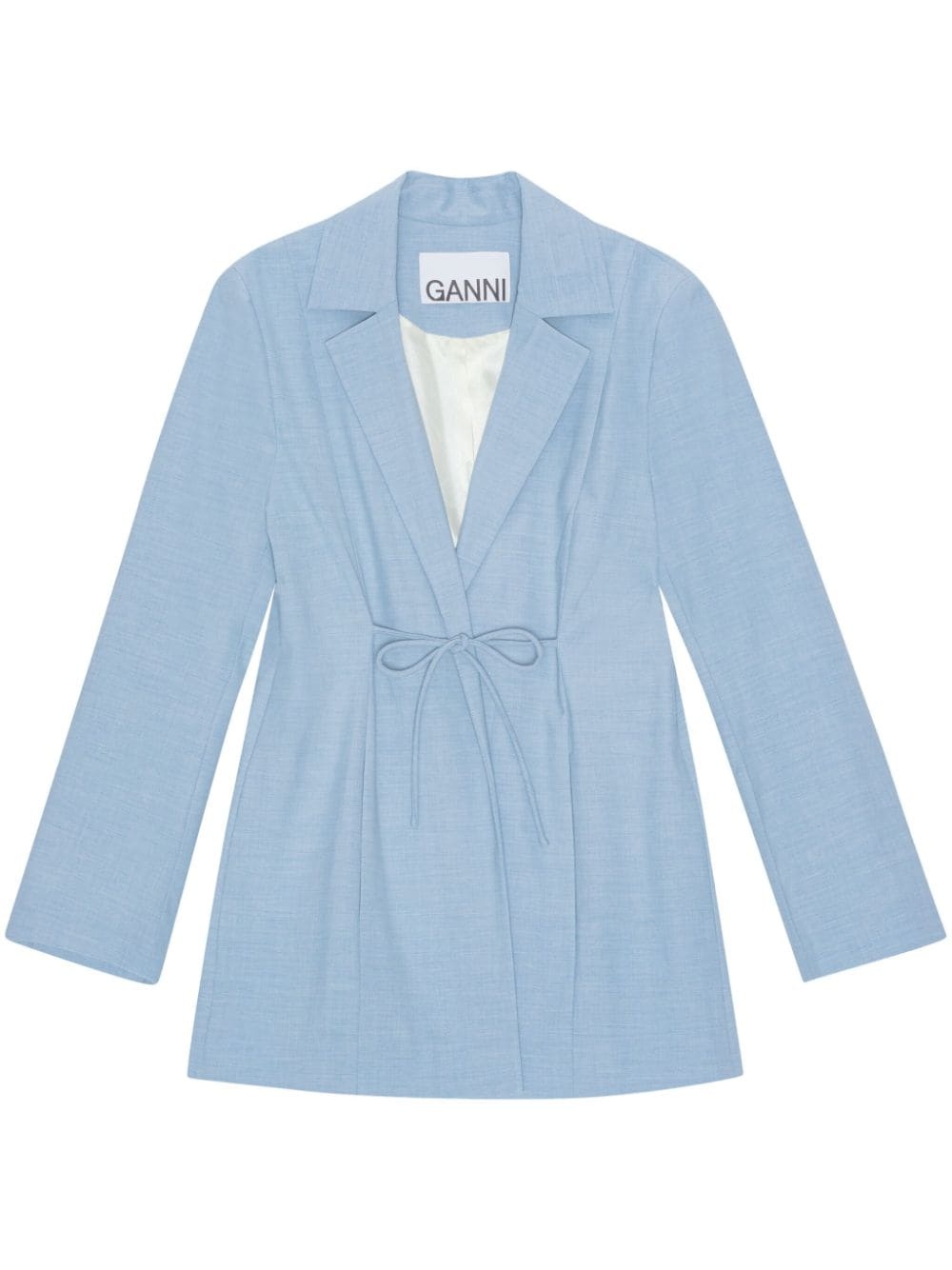 notched-lapels string-tie blazer This GANNI blazer is cut from blue worsted tailoring fabric with smart notch lapels and slender self-ties at the front and back of the waist to secure and adjust the silhouette. The satin lining ensures smooth layering. Highlights - Powder blue - Recycled polyester blend/ecovero™ viscose blend - Stretch-design - Notched lapels - Bow detailing - Tie strings - Long sleeves - Straight hem Imported Composition EcoVero Viscose (LENZING) 48%, Recycled Polyester 44%, Elastane 5%, Polyester 3% Washing instructions Read Manufacturer Guidelines