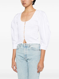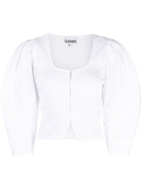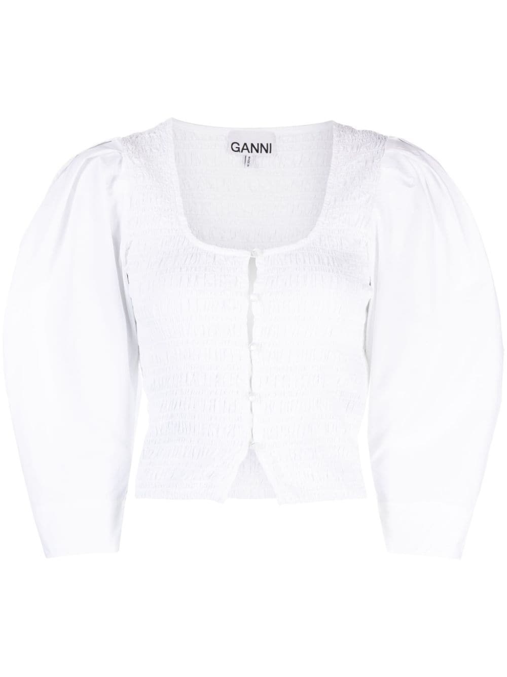 organic cotton-poplin blouse GANNI showcases a romantic aesthetic with this white poplin blouse. It's crafted from organic cotton and framed with a smocked bodice and puff sleeves. Highlights - White - Organic cotton - Poplin texture - Smocked panel - Round neck - Front button fastening - Three-quarter length puff sleeves - Cropped Imported Composition Cotton 100% SIZE & FIT Model measurements Height 5 ft 10 in(1.77 m) Bust/Chest 31.49 in(80 cm) Hips 35.43 in(90 cm) Waist 25.19 in(64 cm) FittingInformation Designed for a slim fit that sits just away from the body offering a close yet comfortable fit Made from a midweight non-stretch fabric, this piece offers minimal elasticity when worn This piece fits true to size – take your usual size Washing instructions Machine Wash