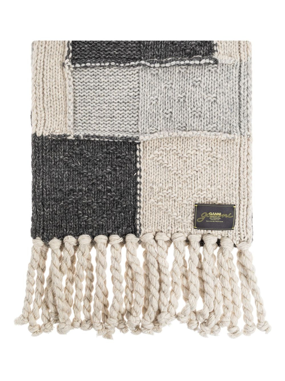 patchwork fringed scarf Highlights - Grey/multicolor - Patchwork design - Knitted - Fringed trim Imported Composition Wool 55%, Organic Cotton 45% SIZE & FIT Measurement LENGTH 43.3 in(110 cm) WIDTH 17.71 in(45 cm) Washing instructions Hand Wash