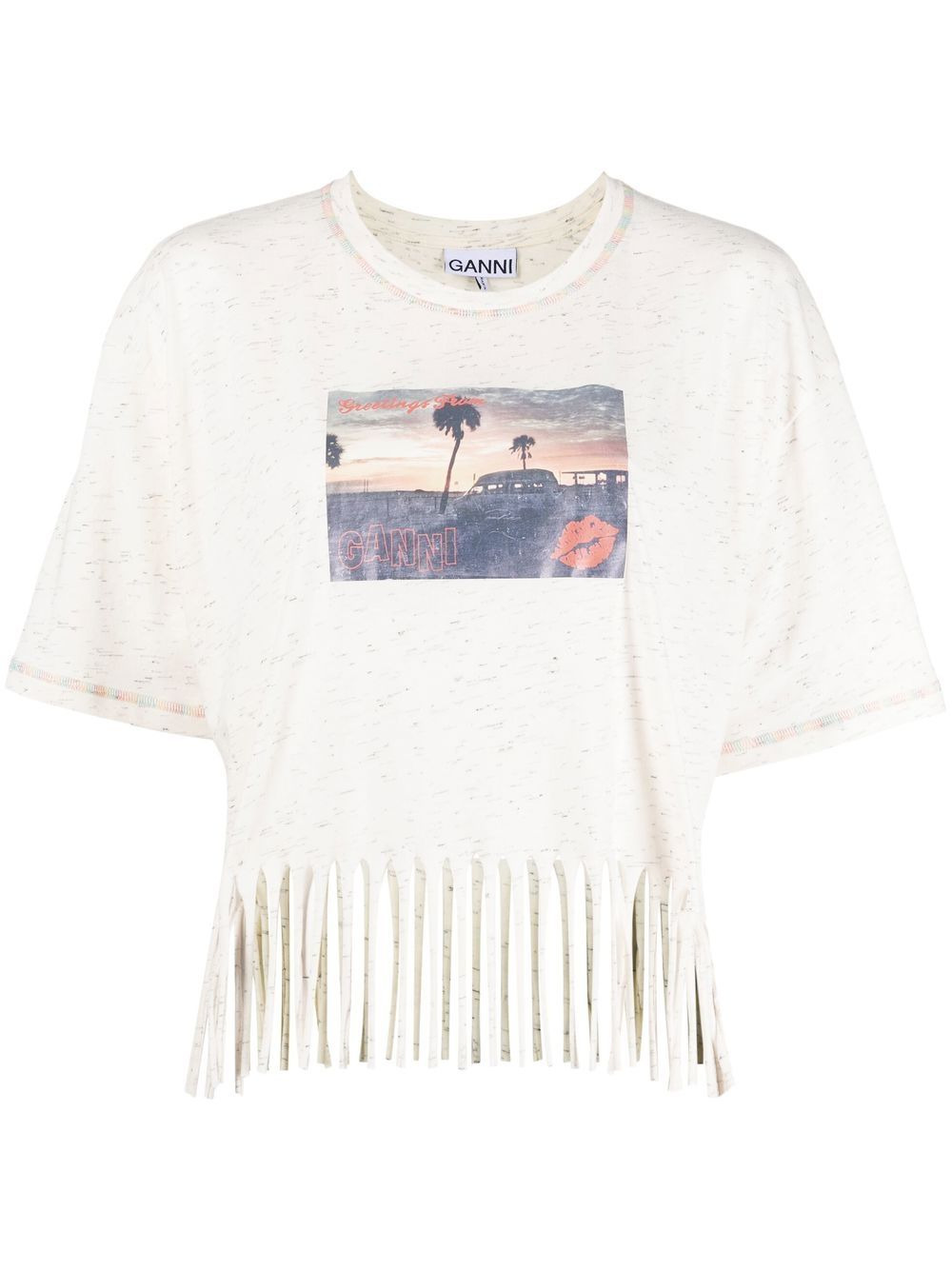 photo-print fringed T-shirt GANNI creates a summer-inspired style with this marled T-shirt. Made from an organic cotton blend, this short-sleeved design features a photographic sunset print to the front and a cropped hem with fringing. Highlights - Off-white - Organic cotton blend - Marl effect - Photograph print to the front - Fringed hem - Crew neck - Drop shoulder - Short sleeves - Cropped Imported Composition Organic Cotton 99%, Viscose 1% SIZE & FIT Model measurements Height 5 ft 10 in(1.77 m) Bust/Chest 32.28 in(82 cm) Hips 35.03 in(89 cm) Waist 25.19 in(64 cm) FittingInformation This piece fits true to size. We recommend you get your regular size Cut for a loose fit Made with a mid-weight fabric Washing instructions Machine Wash