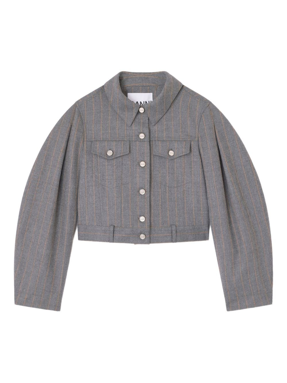 pinstripe puff-sleeve jacket Highlights - Grey - Pinstripe pattern - Puff sleeves - Cropped length - Button fastening - Flap pockets Imported Composition Fabric 100% Washing instructions Read Manufacturer Guidelines