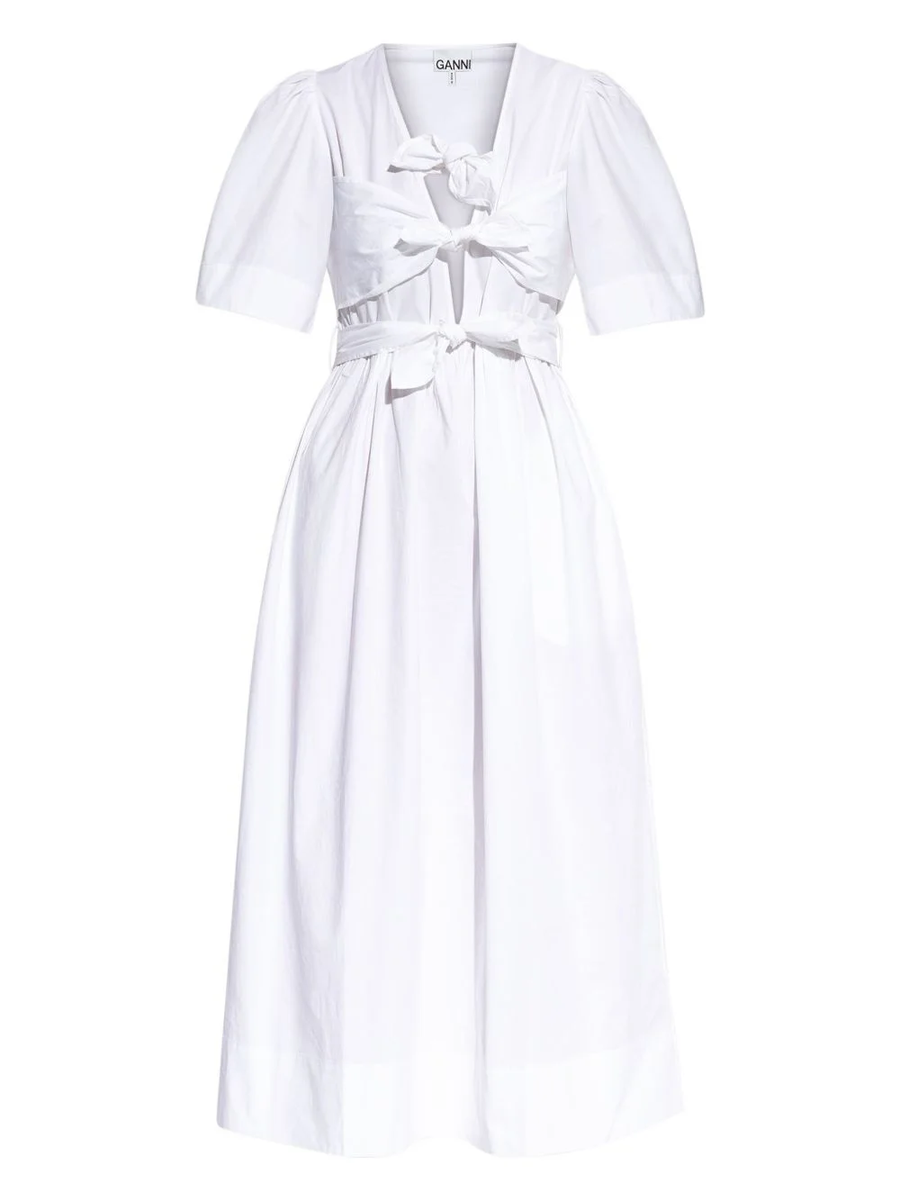 poplin dress Highlights - White - Self-tie fastening - Two side slit pockets - Bow detailing - Cut-out detailing Imported Composition Organic Cotton 97%, Elastane 3% Washing instructions Read Manufacturer Guidelines