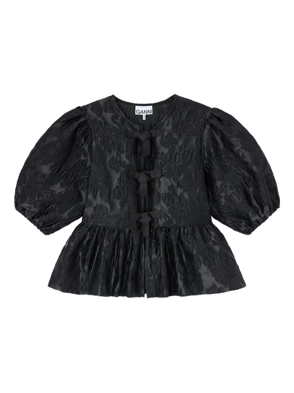 puff-sleeve bow top Highlights - Black - Floral pattern - Bow detail - Round neck - Short sleeves - Gathered waist Imported Composition Fabric 100% Washing instructions Read Manufacturer Guidelines