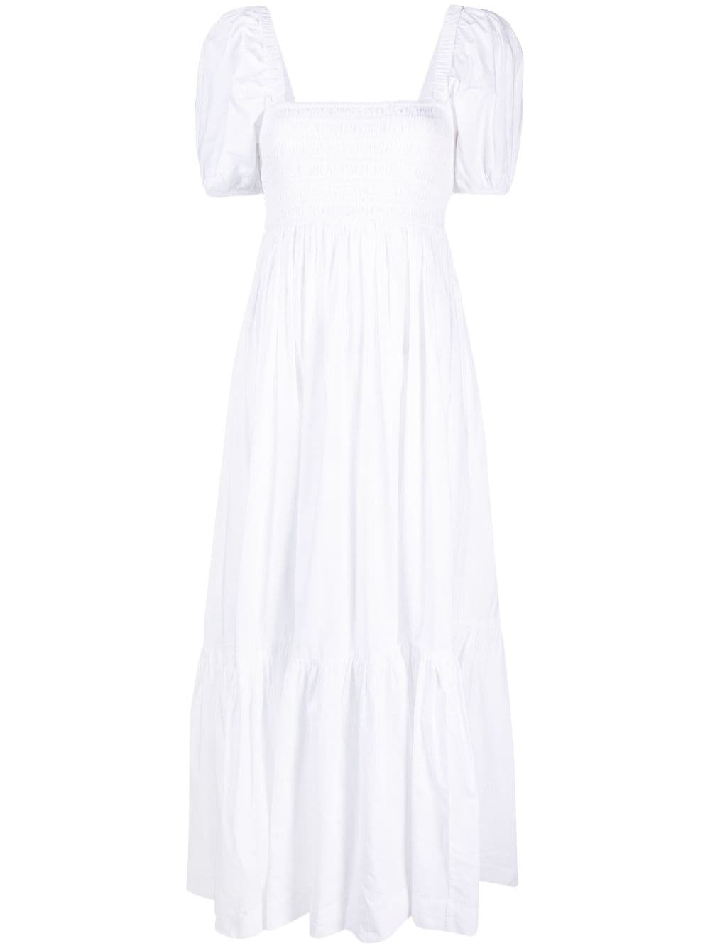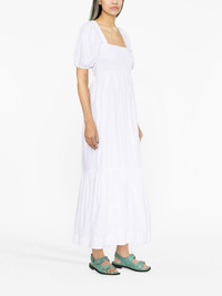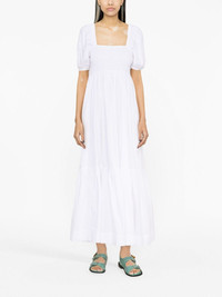 puff-sleeve organic cotton dress GANNI’s dress is a crisp reimagining of classic prairie styles. Cut from white organic cotton to a tiered silhouette, it’s framed with a shirred bodice and short puff sleeves. Highlights - White - Organic cotton - Pleat detailing - Square neck - Short puff sleeves - Tiered skirt Imported Composition Organic Cotton 100% SIZE & FIT Model measurements Height 5 ft 10 in(1.77 m) Bust/Chest 32.67 in(83 cm) Hips 35.43 in(90 cm) Waist 23.62 in(60 cm) Measurement LENGTH 57.48 in(146 cm) WAIST 47.24 in(120 cm) BUST 37.79 in(96 cm)