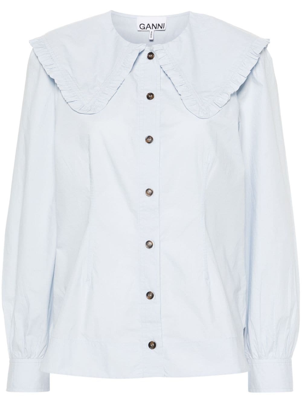 puritan-collar cotton shirt Highlights - Light blue - Organic cotton - Puritan collar - Poplin texture - Ruffled trim - Long sleeves - Buttoned cuffs - Curved hem - Front button fastening Imported Composition Organic Cotton 100% SIZE & FIT Model measurements Height 5 ft 9 in(1.76 m) Bust/Chest 31.88 in(81 cm) Hips 35.43 in(90 cm) Waist 24.8 in(63 cm) FittingInformation Designed for a slim fit that sits just away from the body offering a close yet comfortable fit The dart stitching adds structure and a closer fit in the torso of this piece Made from a midweight non-stretch fabric This piece fits true to size – take your usual size Washing instructions Machine Wash