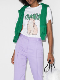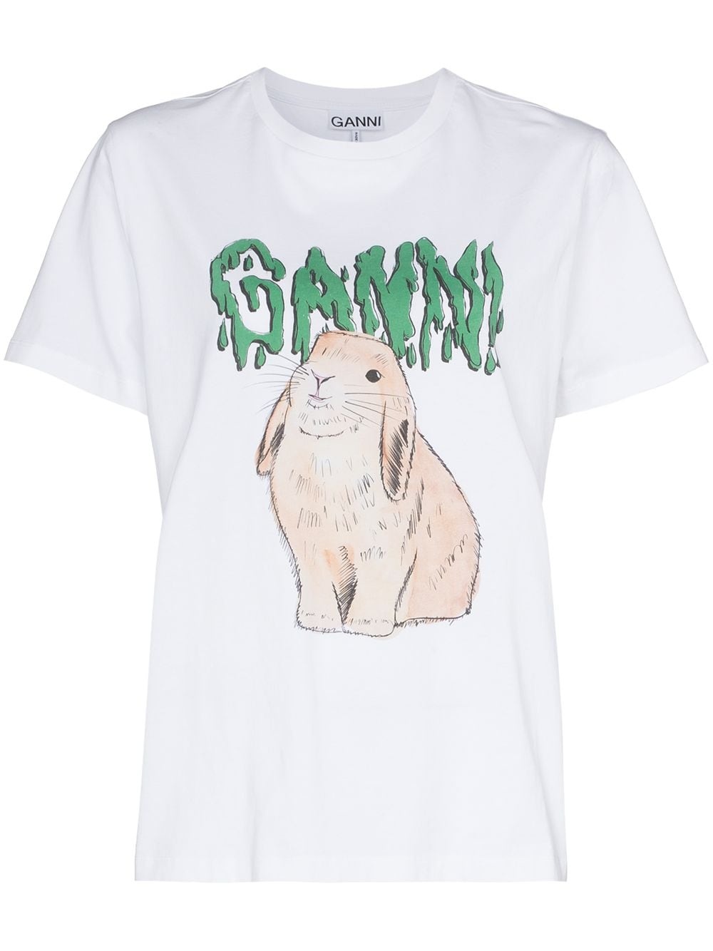 Rabbit logo T-shirt Fluffy, sweet and organic cotton can never be a bad thing. So if there's one thing you can rely on from Ganni's Rabbit logo T-shirt, it's that it'll give you a warm fuzzy feeling on the inside. How sweet. Highlights - White - Organic cotton - Round neck - Graphic print at the chest - Jersey knit - Straight hem - Short sleeves Imported Composition Organic Cotton 100% SIZE & FIT Model measurements Height 5 ft 11 in(1.8 m) Bust/Chest 32.67 in(83 cm) Hips 35.82 in(91 cm) Waist 25.98 in(66 cm) FittingInformation This piece fits true to size. We recommend you get your regular size Cut for a relaxed fit Made with a mid-weight fabric Washing instructions Machine Wash