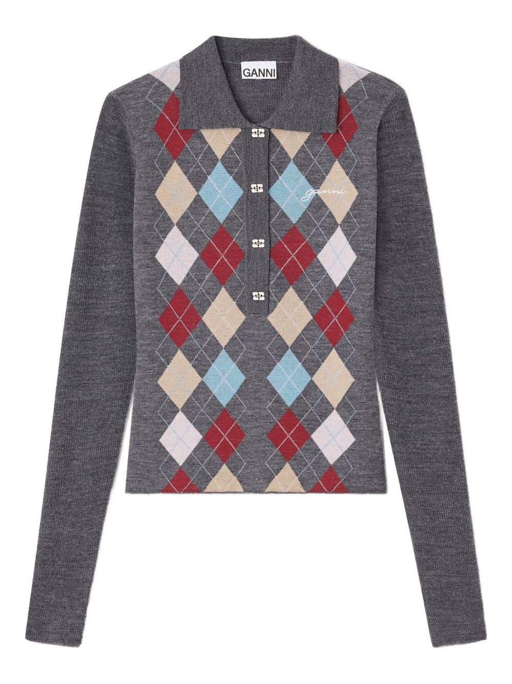 ribbed polo-neck top Highlights - Dark grey - Logo-shaped buttons - Multicolour pattern - Long sleeves - Ribbed cuffs - Button fastening - Polo neck Imported Composition RWS Merino Wool 100% Washing instructions Read Manufacturer Guidelines