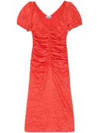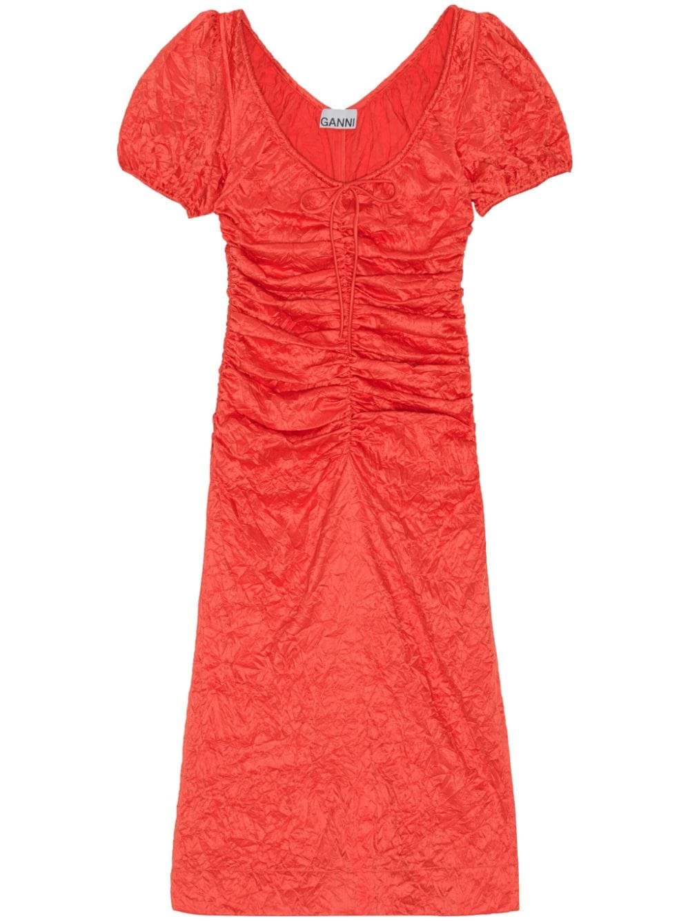 ruched midi dress This red dress from GANNI is meticulously crafted from a recycled polyester blend. The crinkled finish lends a unique texture, while the scoop neck and short puff sleeves showcase the brand's penchant for a dainty aesthetic. Highlights - Red - Recycled polyester blend - Crinkled finish - Scoop neck - Short puff sleeves - Ruched detailing - A-line - Straight hem - Mid-length Imported Composition Recycled Polyester 95%, Elastane 5% Washing instructions Read Manufacturer Guidelines