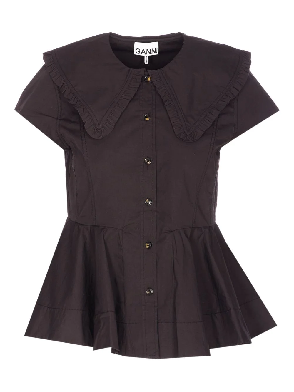ruffled button shirt Highlights - Black - Ruffled collar - Button closure - Sleeveless - A-line Imported Composition Organic Cotton 97%, Spandex/Elastane 3% Washing instructions Read Manufacturer Guidelines