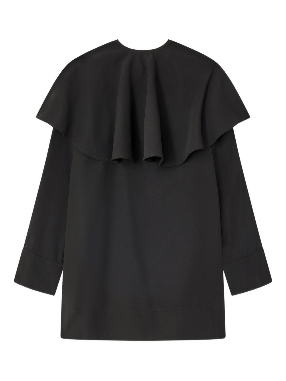 ruffled cape-attachment mini dress Highlights - Black - Cape collar - Ruffled neckline - Long sleeves - Straight hem Imported Composition Fabric 100% Washing instructions Read Manufacturer Guidelines