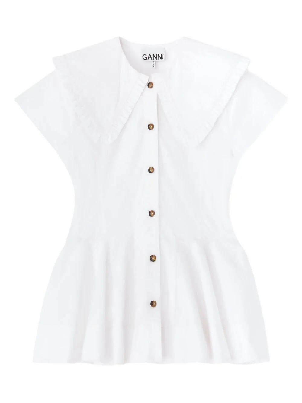 ruffled collar buttoned top Highlights - White - Ruffled trim - Button fastening - Short sleeves - Peplum hem Imported Composition Fabric 100% Washing instructions Read Manufacturer Guidelines