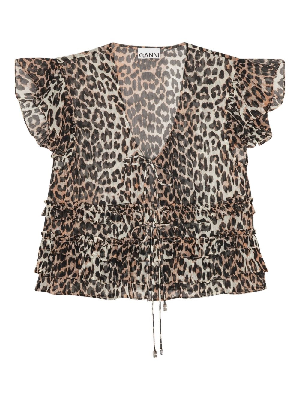 ruffled leopard-print blouse Highlights - Beige - Leopard print - Deep v-neck - Flutter sleeves - Ruffled hem - Adjustable drawstring waist Imported Composition Fabric 100% Washing instructions Read Manufacturer Guidelines