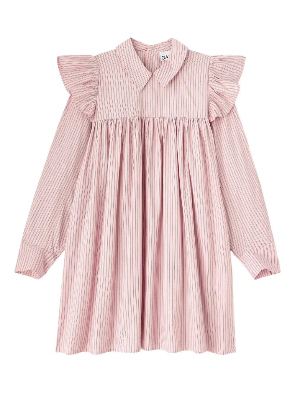 ruffled striped mini dress Highlights - Light pink - Striped - Ruffled shoulders - Long sleeves - Button fastening - Collared Imported Composition Fabric 100% Washing instructions Read Manufacturer Guidelines