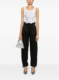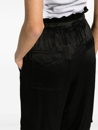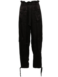satin cargo trousers A combination of considered fabrics and utilitarian design cues, these black GANNI trousers are panelled from LENZING™ ECOVERO™ satin with a medley of cargo pockets and drawstrings at the paperbag waist and cuffs. Highlights - Black - Ecovero™ blend - Satin finish - Panelled design - Paperbag waist - Two side slash pockets - Two front flap pockets - Two side cargo pockets - Rear welt pocket - Rear flap pocket - Drawstring cuffs - Drawstring fastening Imported Composition Viscose 50%, Cupro 50% SIZE & FIT Model measurements Height 5 ft 9 in(1.76 m) Bust/Chest 31.88 in(81 cm) Hips 35.43 in(90 cm) Waist 24.8 in(63 cm) FittingInformation Designed for a straight-leg fit, these trousers allow for a close fit at the waist and an unrestricted, comfortable fit over the leg The internal drawstring at the hem allows for fitted preferences at the ankle Made from a midweight non-stretch fabric This piece fits true to size – take your usual size