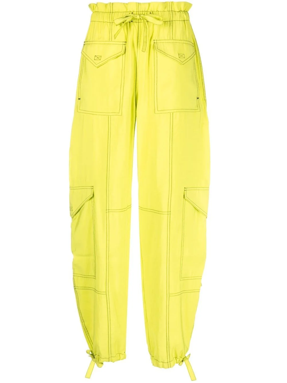 seam-detail cargo pants GANNI's lighthearted approach to design is evident in these cargo pants. In a vibrant green hue, the multiple pockets and seams are highlighted with contrasting darker stitching. Highlights - Green - Recycled polyester blend - Contrast stitching - High waist - Elasticated drawstring waistband - Two side inset pockets - Two side flap pockets - Two side cargo pockets - Two rear flap pockets - Elasticated ankles Imported Composition Viscose 88%, Recycled Polyester 12% SIZE & FIT Model measurements Height 5 ft 10 in(1.77 m) Bust/Chest 32.67 in(83 cm) Hips 35.43 in(90 cm) Waist 23.62 in(60 cm) FittingInformation This piece fits true to size. We recommend you get your regular size Designed to be fitted at the waist and hips, loose over the leg Made with a mid-weight non-stretch fabric Washing instructions Machine Wash