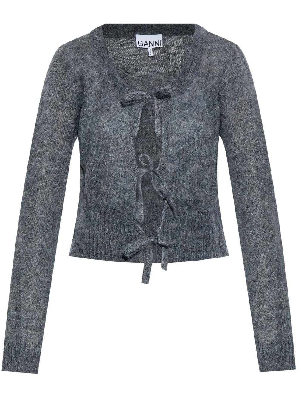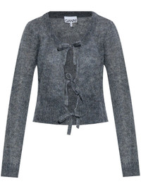 self-tie fastening cardigan Highlights - Grey - Mohair blend - Knitted construction - Melange effect - Self-tie fastening - Scoop neck - Long sleeves - Ribbed cuffs and hem Imported Composition Mohair 55%, Recycled Polyamide 29%, Merino 16%