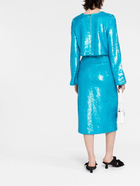 sequin-embellished midi skirt GANNI spotlights its bold aesthetic with this midi skirt. Punctuated by a thigh-high side split, it’s saturated with scores of sequins in a vibrant blue hue. Highlights - Bright blue - Recycled polyester - High waist - Sequin embellishment - Side slit - Mid-length Imported Composition Outer: Recycled Polyester 100% Lining: Recycled Polyester 100% SIZE & FIT Model measurements Height 5 ft 9 in(1.76 m) Bust/Chest 31.49 in(80 cm) Hips 36.61 in(93 cm) Waist 24.8 in(63 cm) Washing instructions Machine Wash