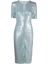 sequinned midi dress GANNI celebrates self-expression through its high-octane designs, like this dress. It’s embellished with glistening ice-blue sequins. Highlights - Light blue - Recycled polyester - Sequin design - Keyhole neck - Rear zip fastening - Short sleeves - Front slit - Straight hem Made in Italy Composition Lining: Recycled Polyester 100% Outer: Recycled Polyester 100%