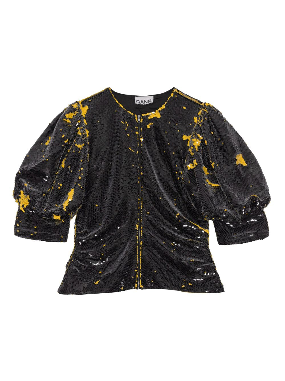sequinned puff-sleeve blouse Highlights - Black - Sequin embellishment - Short puff sleeves - Zip front - Ruched detailing Imported Composition Polyester 100% Washing instructions Read Manufacturer Guidelines