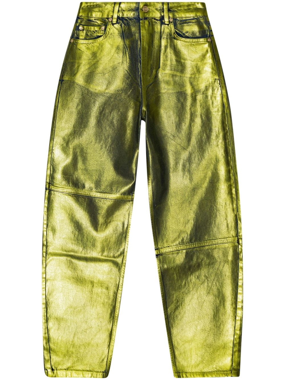 Stary foiled tapered jeans GANNI's Stary jeans are characterised by their vibrant finish and relaxed silhouette. The pair is rendered in green with a foiled effect, whilst offering a voluminous tapered design. Highlights - Lime green - Organic cotton - Foiled finish - High-waisted - Belt loops - Concealed fly and button fastening - Classic five pockets - Tapered leg Imported Composition Organic Cotton 100% Washing instructions Read Manufacturer Guidelines