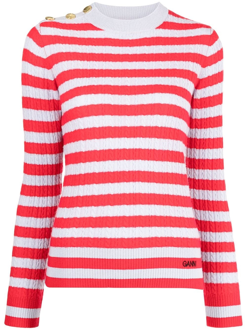 striped cable knit jumper Highlights - Red/white - Cashmere-merino blend - Two-tone design - Cable knit - Decorative button detailing - Embroidered logo to the side - Round neck - Long sleeves - Ribbed hem Imported Composition Cashmere 50%, Merino 50% SIZE & FIT Model measurements Height 5 ft 10 in(1.77 m) Bust/Chest 31.49 in(80 cm) Hips 34.64 in(88 cm) Waist 23.62 in(60 cm) FittingInformation This piece fits true to size. We recommend you get your regular size Cut for a loose fit Made with a mid-weight fabric Washing instructions Hand Wash